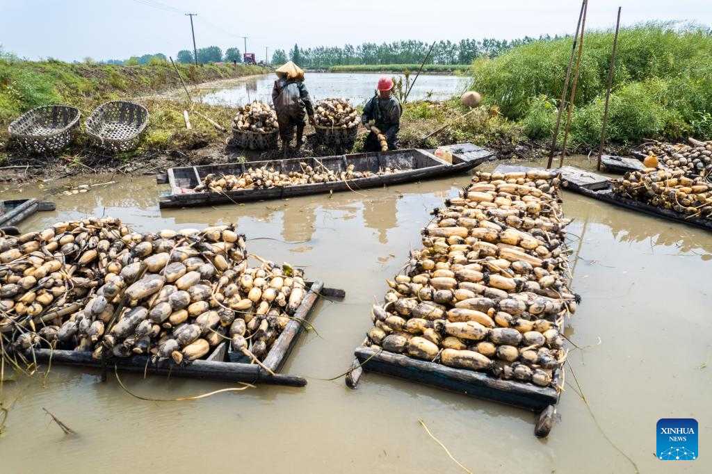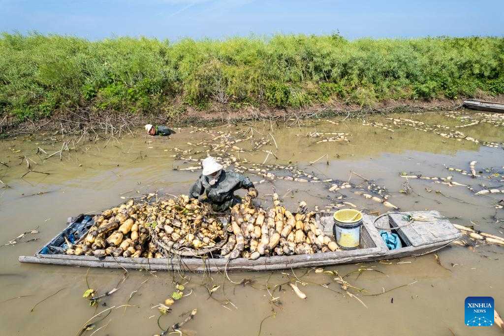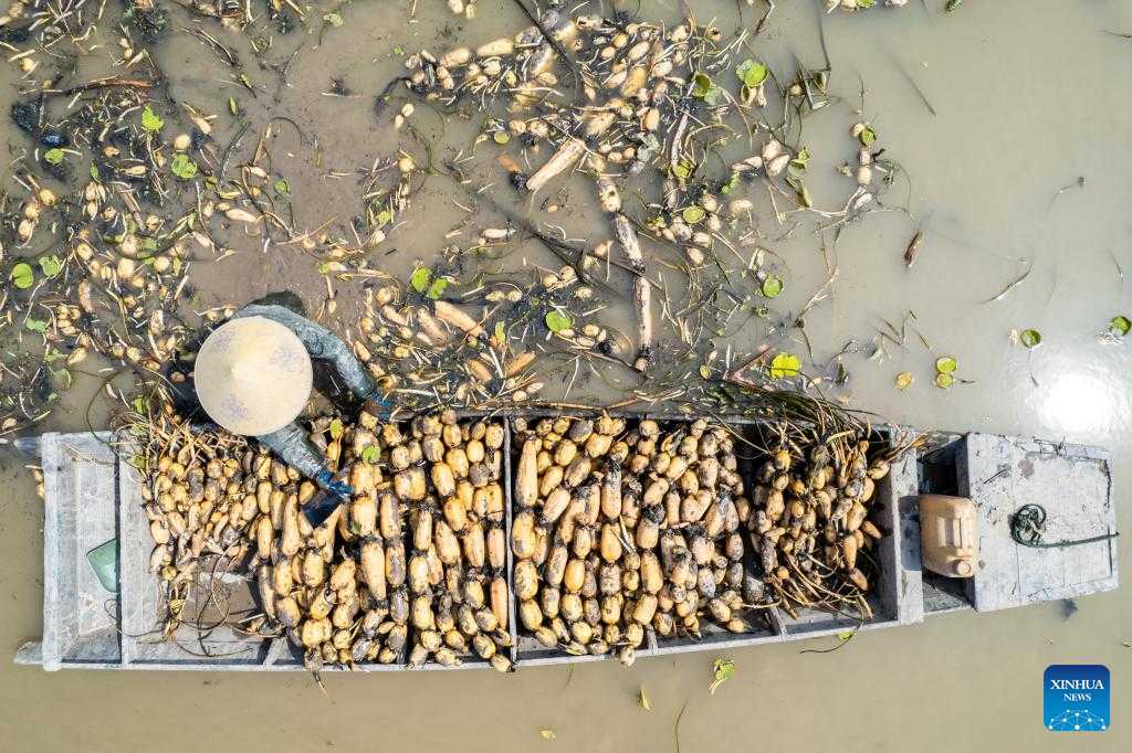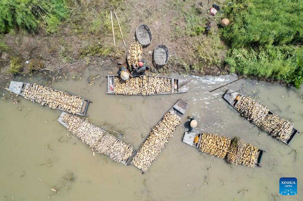 A farmer transfers the newly-harvested lotus roots onto the riverbanks in the Lingjiaohu Village of Nanxian County, Yiyang City, central China's Hunan Province, April 26, 2023. Farmers in Lingjiaohu Village of Nanxian County have recently been busy with harvesting lotus roots. (Xinhua/Chen Sihan)