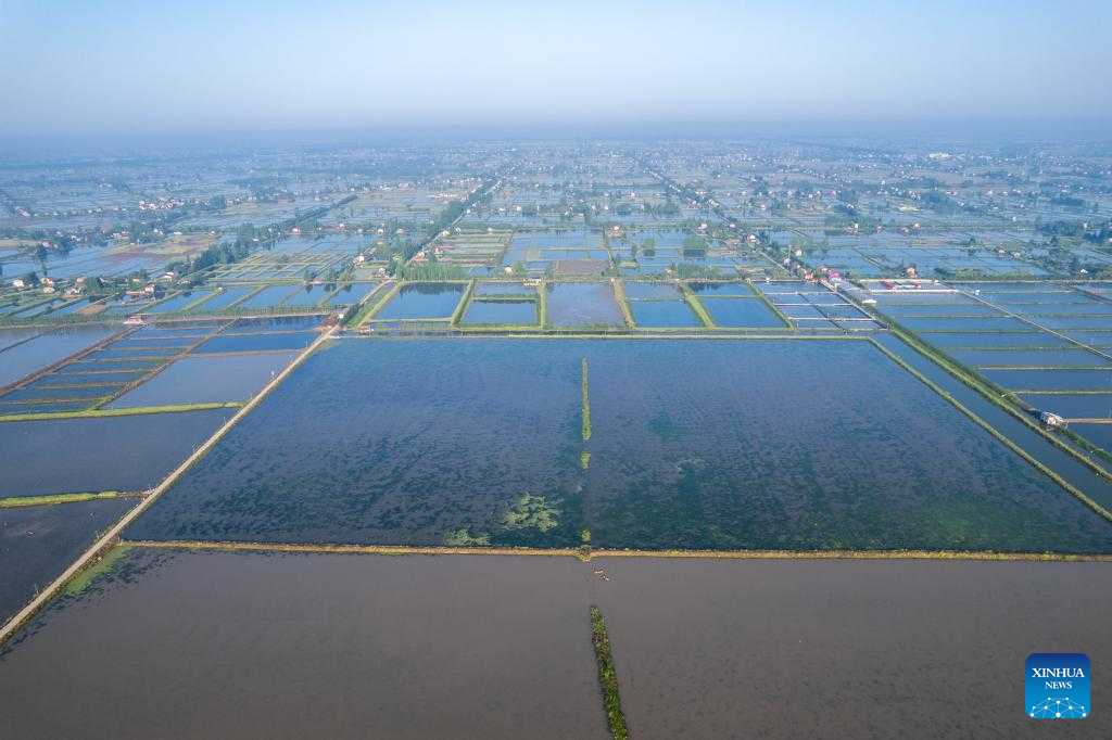 This aerial photo taken on April 26, 2023 shows the view of the Lingjiaohu Village of Nanxian County, Yiyang City, central China's Hunan Province. Farmers in Lingjiaohu Village of Nanxian County have recently been busy with harvesting lotus roots. (Xinhua/Chen Sihan)