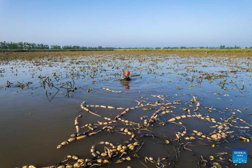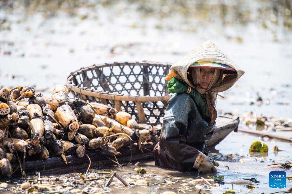 A farmer harvests the lotus roots at a lotus pond in the Lingjiaohu Village of Nanxian County, Yiyang City, central China's Hunan Province, April 26, 2023. Farmers in Lingjiaohu Village of Nanxian County have recently been busy with harvesting lotus roots. (Xinhua/Chen Sihan)