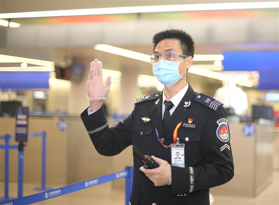 Wu Ge works at the security checkpoint of the Pudong airport.