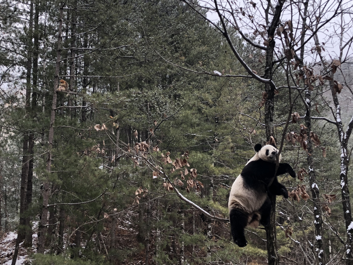 A panda rests on a tree in the national nature reserve in Hanzhong, Shaanxi Province, in December 2018 (COURTESY PHOTO)
