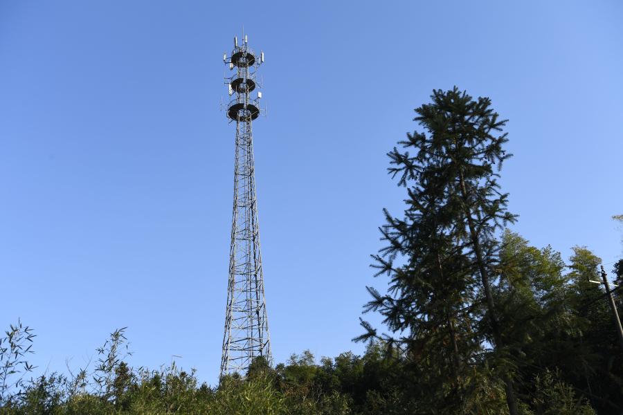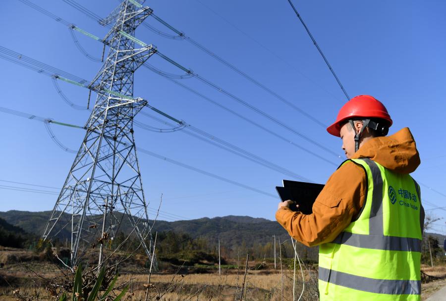 A staff member of China Mobile Anhui tests 5G network speed at the Jiuhua UHV dense transmission channel in Chizhou, east China's Anhui province, Nov. 30, 2021. (Xinhua/Liu Junxi)