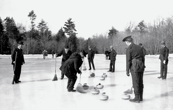 1890年,在美国马萨诸塞州波士顿的“牙买加池塘”冰面上,一场冰壶比赛正在进行
