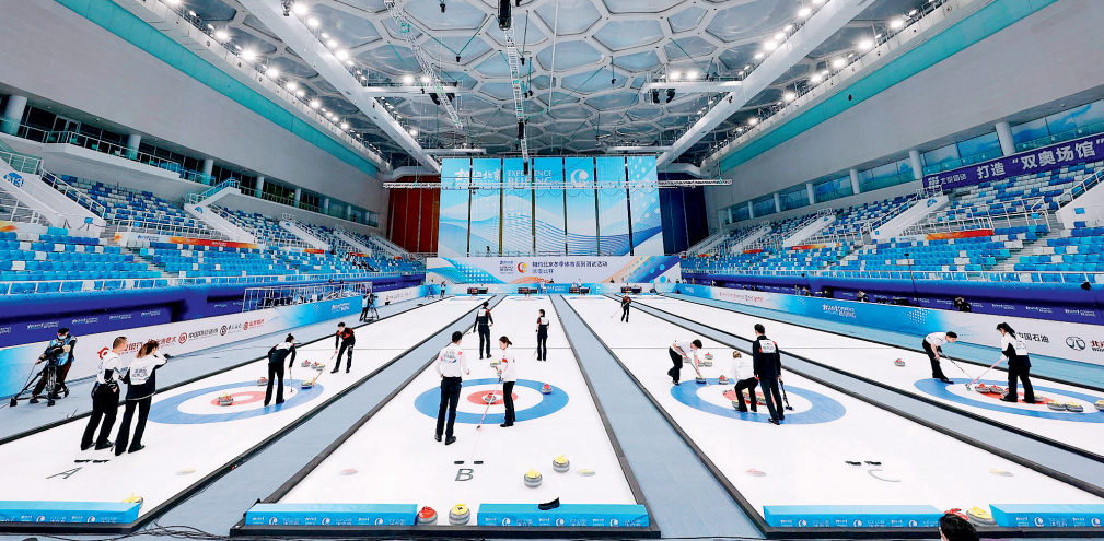 2021年4月,在北京“冰立方”举行的冰壶比赛,这是为迎接 2022 年北京冬奥会而举行的系列“冰上测试赛”的一部分。通过“冰水转换”,这里将成为世界唯一水上项目和冰上项目均可运行的双奥场馆