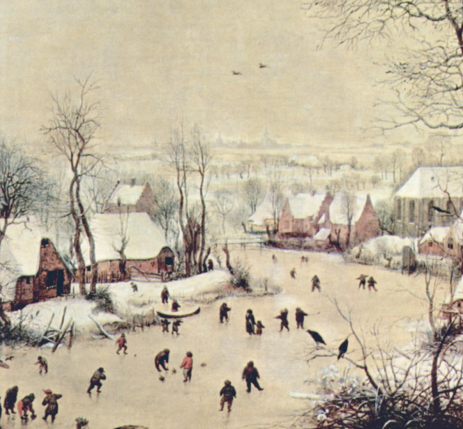 《有滑冰者和捕鸟器的冬景》 (局部),1565,荷兰,老彼得· 勃鲁盖尔,油画,现藏比利时皇家美术博物馆。画中可见人们在玩冰上溜石的游戏,这幅画也是老勃鲁盖尔作品中被复制得最多的一幅