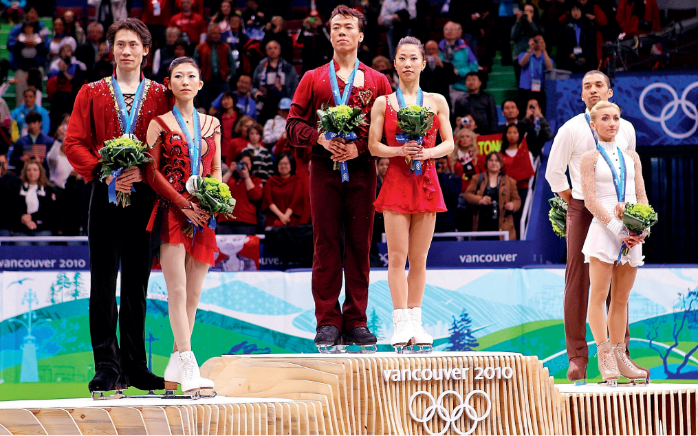2010年温哥华冬奥会上花样滑冰双人滑的颁奖现场,申雪/赵宏博(中)以近乎完美的发挥勇夺温哥华冬奥会花样滑冰双人滑金牌,另一对中国组合庞清/佟健(左)夺得银牌,这是在冬奥会历史上首次由中国选手包揽一个项目的金银牌。来自德国的萨维申科/斯佐尔科维组合获得铜牌