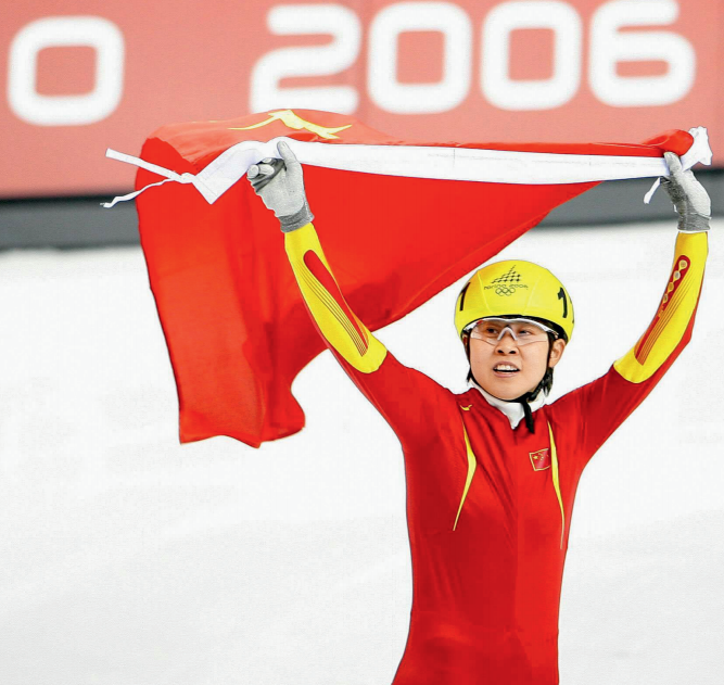 2006年都灵冬奥会上,王濛在短道速滑女子500米比赛夺取金牌后高举国旗绕场庆祝,这也是中国代表团在该届冬奥会获得的首枚金牌