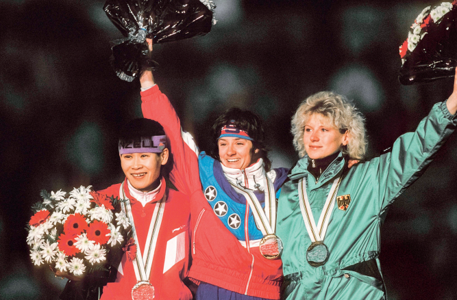 1992年2月14日,法国阿尔贝维尔,冬奥会女子速度滑冰1000米的颁奖仪式。中国选手叶乔波(左)获得亚军,使中国实现了冬奥会上奖牌零的突破。美国选手邦妮·布莱尔(Bonnie Blair)(中)获冠军,德国的加布雷西特(Monique Gabrecht)(右)获得第三名