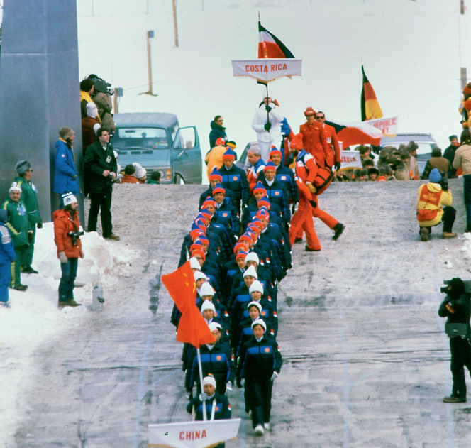 1980年2月14日,在第13届普莱西德湖冬奥会开幕式上的中国代表团准备入场。这是国际奥委会1979年11月恢复中国奥委会合法地位后,中国首次派队参加冬奥会