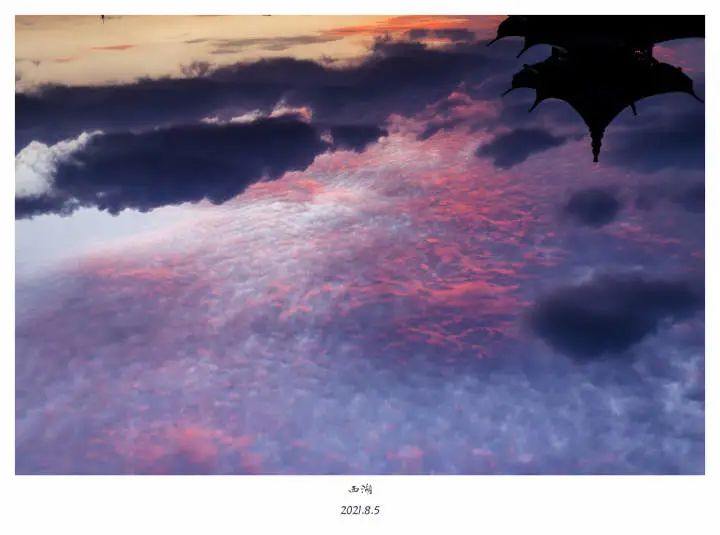 2021年5月底的一天,他被偶然看到的一次西湖晚霞震撼了,“那一天天空的颜色特别漂亮,云朵的样子有点像浙大校徽求是鹰的一半,当时正好有一架飞机飞过,拉出长长的白线,那个画面,简直太棒了。”