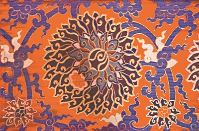 其质地紧密厚重,绸面因纹饰豪放富丽、色彩绚丽,犹如天空中多彩变幻的云霞而得名。