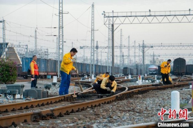 南宁电务段湛江电务车间信号工正在清洁道岔。卜锡龙 摄