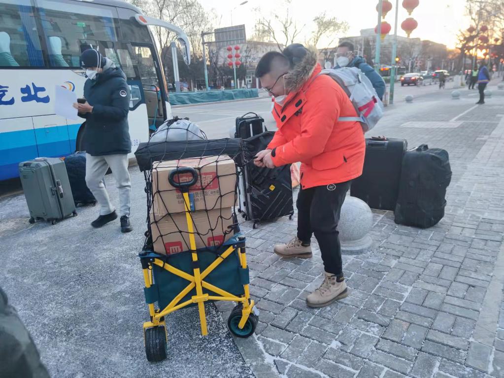 从太子城站到大部队下榻的密苑太子酒店,中间要先在张家口媒体中心换乘一趟车。其实媒体中心离酒店并不远,但出于严格的防疫要求,人员是不能步行前往的。要说一路最辛苦的环节,当属众人把行李搬运上班车。因为至少要在闭环内鏖战50多天,大家都携带了不少大件行李,每次乘车都会把班车塞得满满当当。