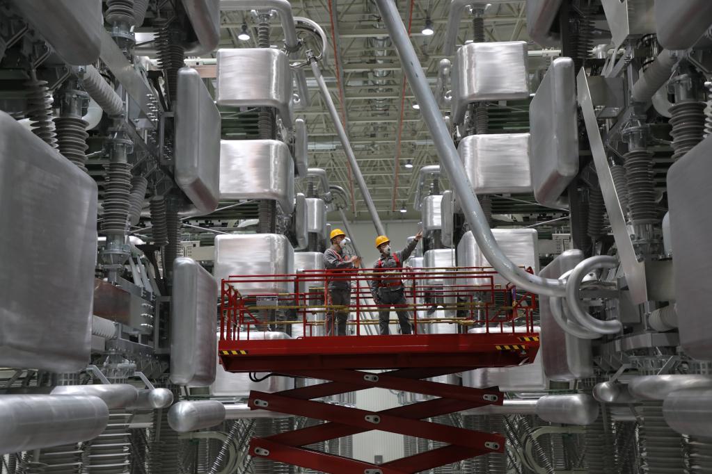2021年8月22日,张北柔性直流电网工程首检期间,运维人员在阀厅内检查换流阀阀塔子模块更换进度。王宇杰摄