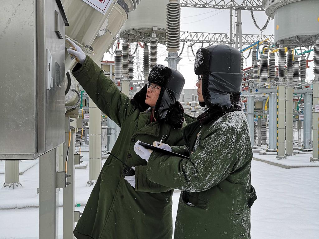2022年1月28日,国网冀北北京超高压公司运维人员冒雪在中都换流站进行冬奥保电巡视。吕越颖摄