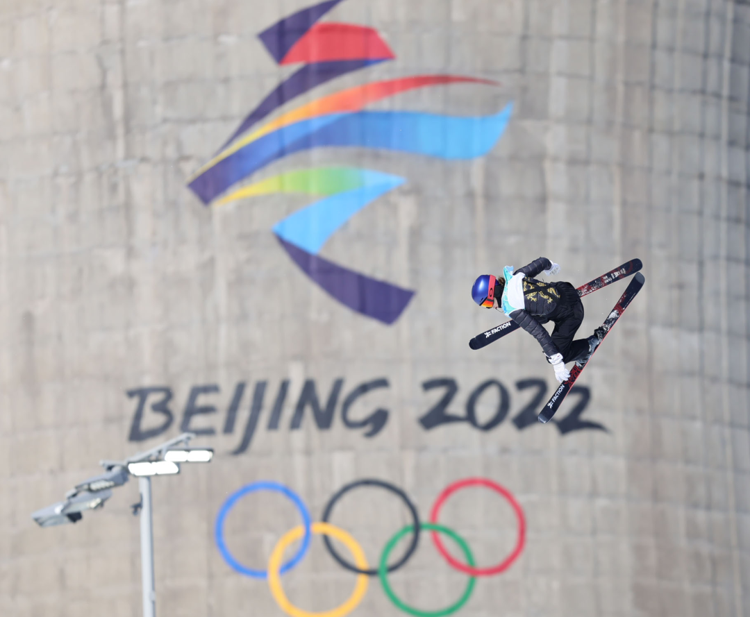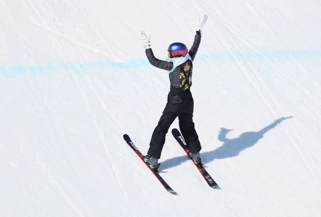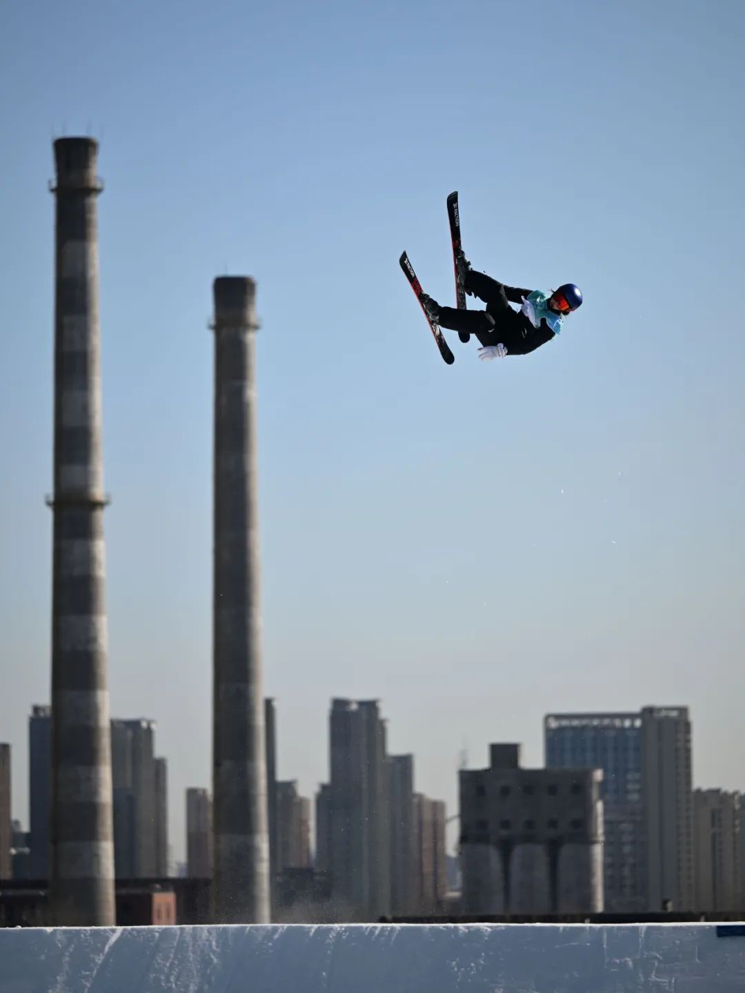 北京的风将谷爱凌托起,扬起她的号码服,雪服后背的“中国龙”被阳光照亮,就像印在了天空。