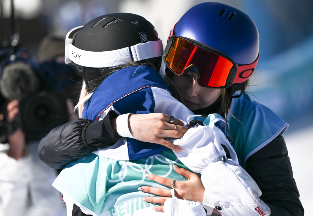 2月8日,中国选手谷爱凌(右)在比赛后拥抱安慰法国选手苔丝·勒德。新华社记者薛宇舸摄