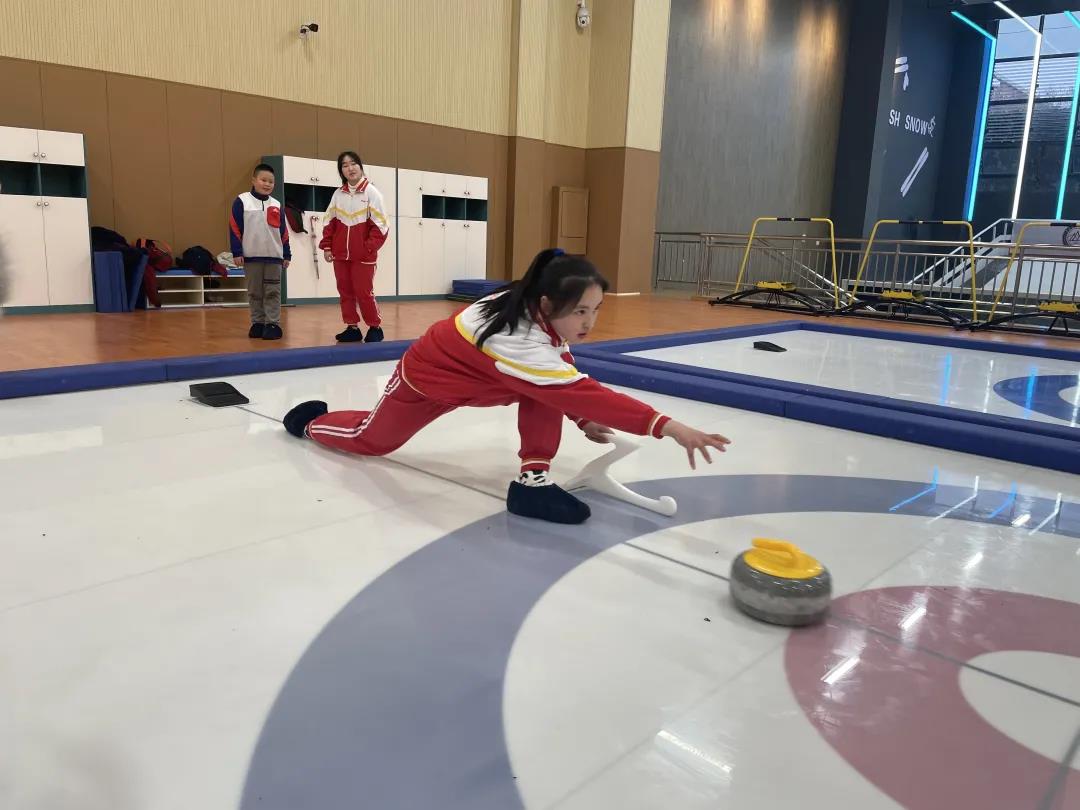 冰雪馆宽敞、气派。在陆地冰壶竞技赛道上,24米长的仿真冰赛道光滑如丝,48个重约10公斤的冰壶齐整地摆放在储物柜里。掷壶时,学生们身体下蹲,脚踩在起踏器上用力向前蹬,身体轻盈地向前跪式滑行。