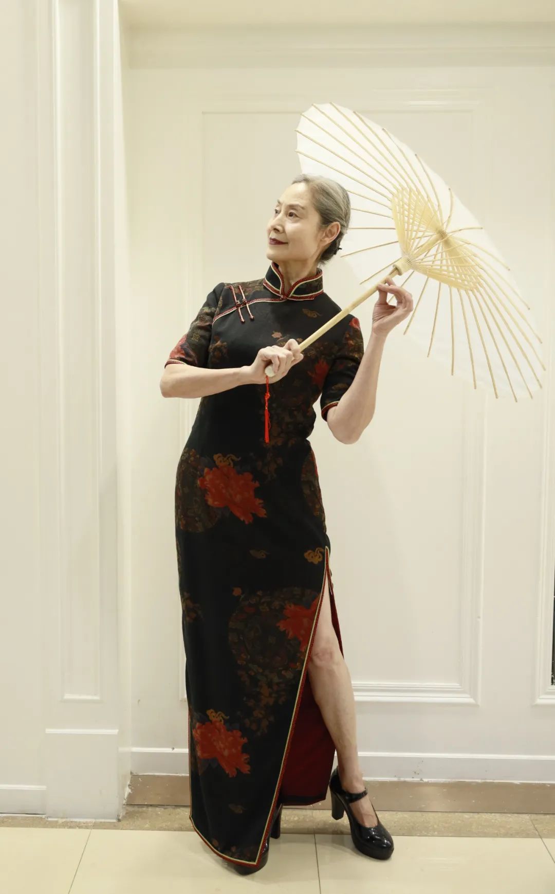 紧身的黑色皮衣皮裤、25厘米的高跟鞋再加上黑色头纱则又是另一种神秘的风格。而到了德国设计师凯瑟琳的沙龙,穿上被国家列为非物质文化遗产的香云纱,她又变成了那个端庄的天蝎奶奶。
