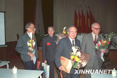 1991年4月25日,科学家王淦昌、王大珩、杨嘉墀、陈芳允(右起)荣获“863计划”荣誉证书(资料照片)。新华社发