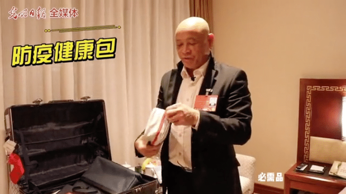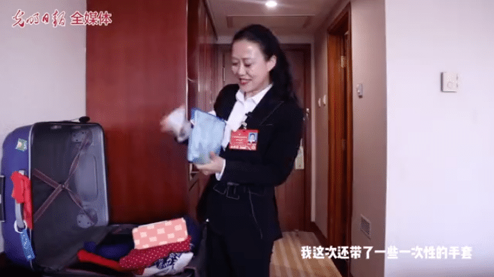 黄细花代表打开行李箱,为我们展示了她精心准备的几套套装。”我准备开会的时候穿这套深蓝色的套装,再搭配一件白色的衬衣。“身着优雅的服装参会,是她眼中的仪式感。黄细花代表告诉我们,与往年不同的是,今年的行李箱多了几件运动服装和一次性手套等物件。她准备在闲暇时间边跑步,边戴上手套捡垃圾,既健康又环保。