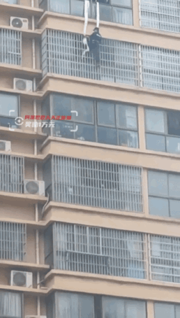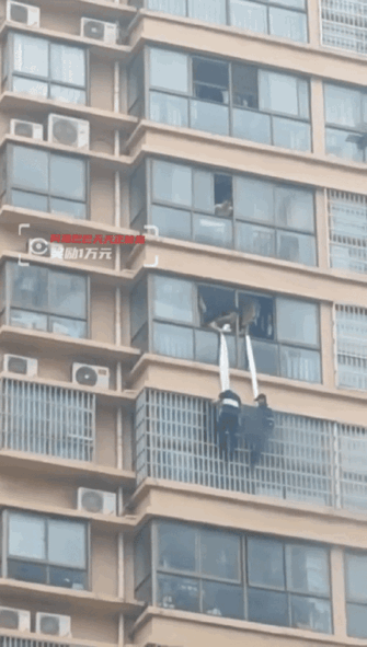 在众人的帮助下,二人用消防水带绑住身体从外墙慢慢往下降,到了18楼窗户前,却又遇到了“拦路虎”——该住户家中安装了防盗窗。