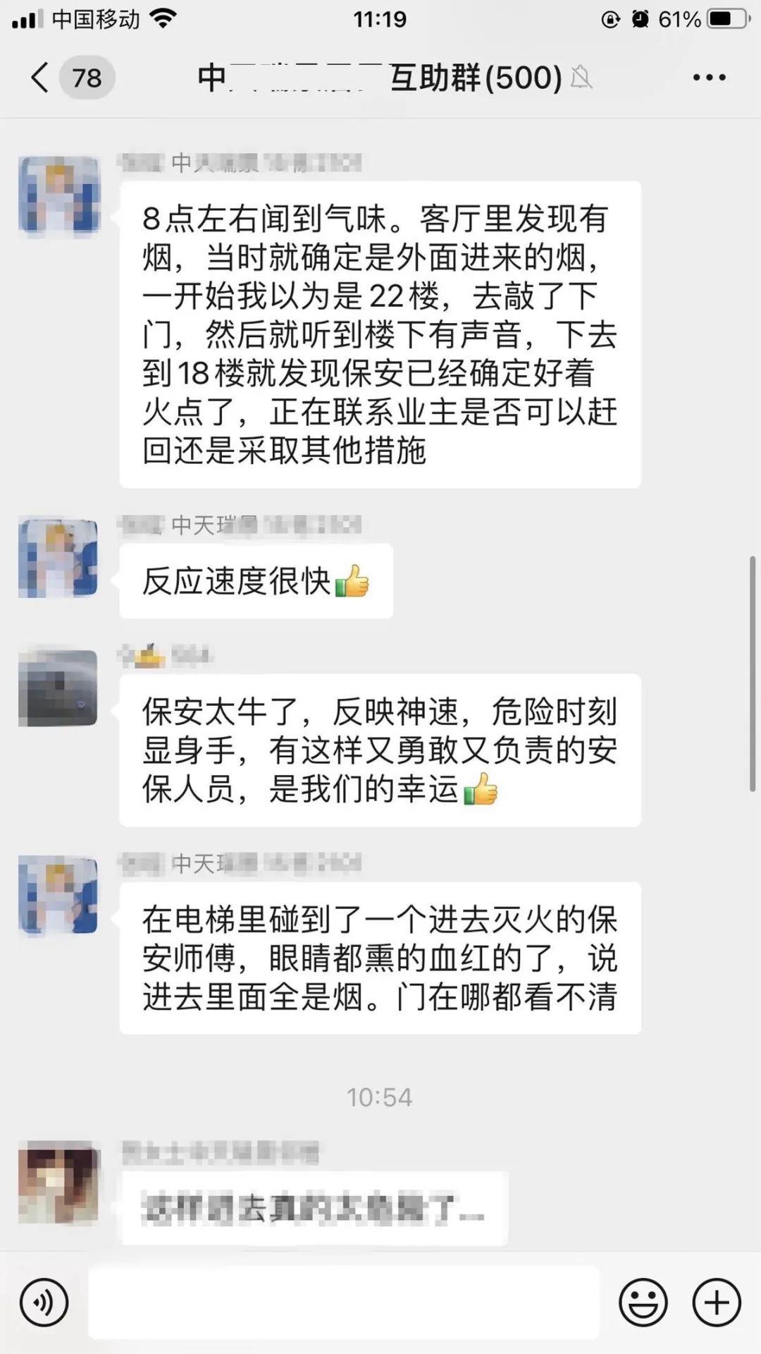 小区业主群讨论保安救火事迹