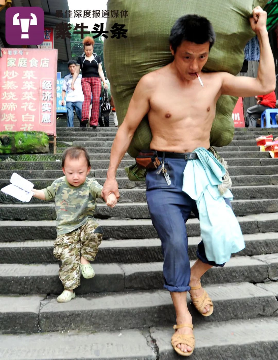 记者注意到, 2010年父亲节那天,还在读大学的许康平在重庆拍摄了一位赤裸上身肩扛着货物,右手牵着儿子从梯坎走下的“棒棒”(重庆挑夫)。这张照片火遍全网络,很多媒体配文点赞:“肩上扛的是全家,嘴里叼着的是自己,手里牵的是未来。”照片的主人公冉光辉也被很多媒体称为重庆“棒棒”的代表。