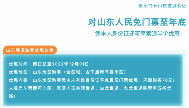“为了表示对山东菏泽第三人民医院贺爱红护士及山东人民的感谢,共同弘扬社会正能量,让更多人在危难之际能得到来自身边陌生人的帮助,洛阳白云山旅游度假区决定即日起至2022年12月31日,山东人民凭身份证游览白云山景区免门票,索道半价!”景区在公告中表示。