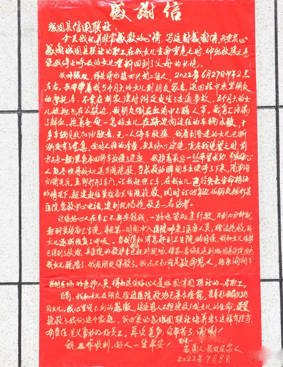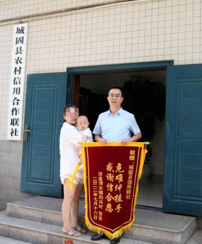 张双母女出院后,经过多方打听,才得知救命恩人正是城固县农村信用合作联社乡镇网点的工作人员,名叫张超。7月15日,她带着锦旗和感谢信专程来到城固信用联社表示感谢。