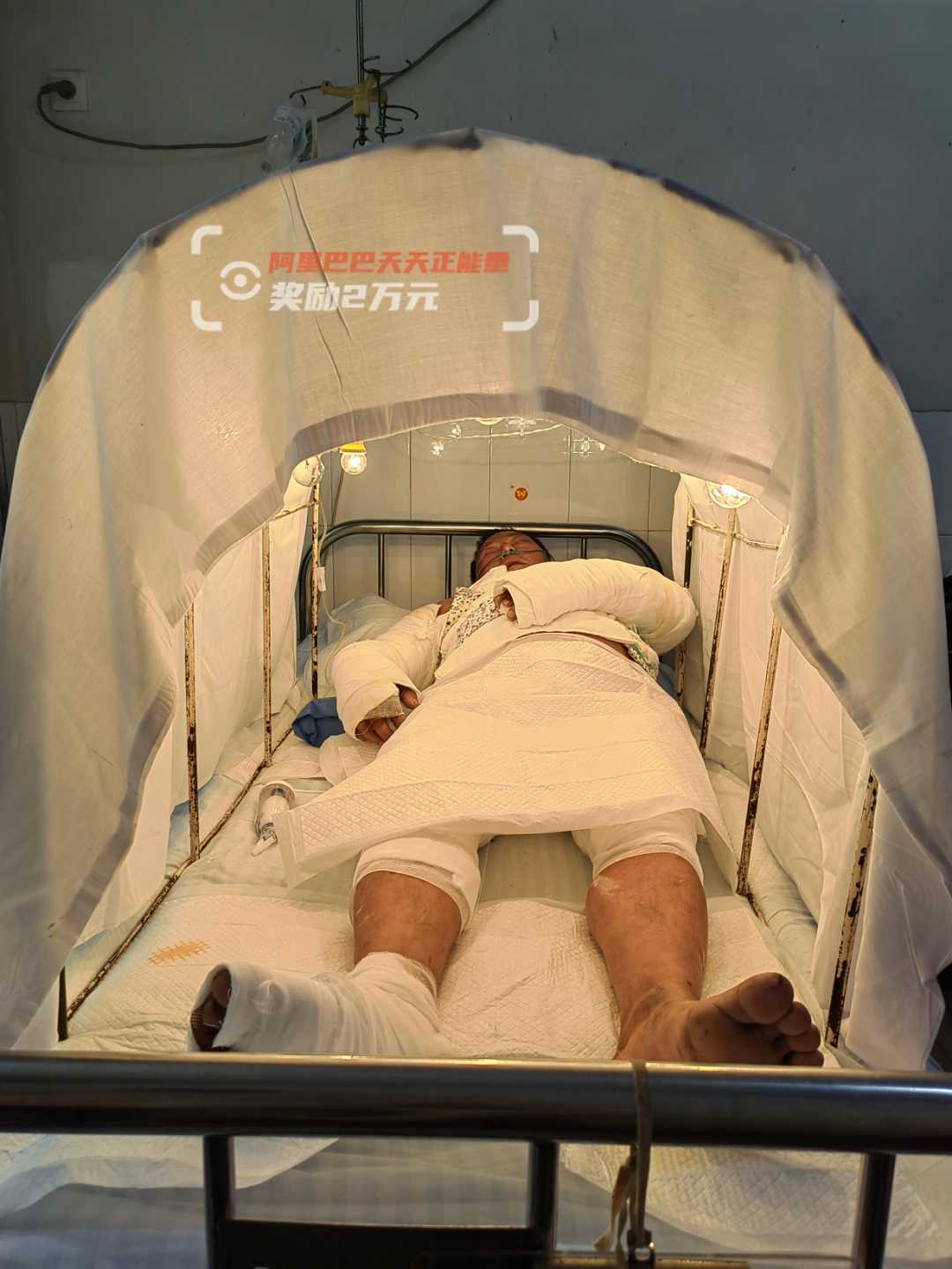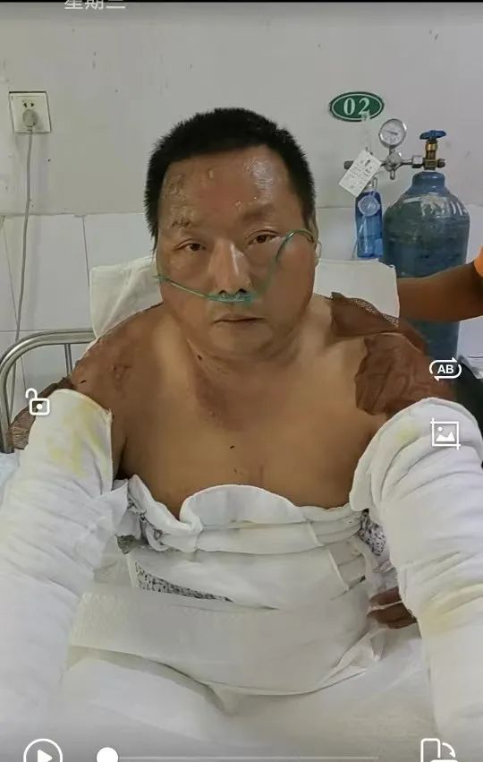 9月7日上午,记者在解放军第989医院烧伤科病房见到了他,只见他四肢和胸背部缠满纱布,裸露的肩部被烧得脱了皮,额面部的水泡已破溃。