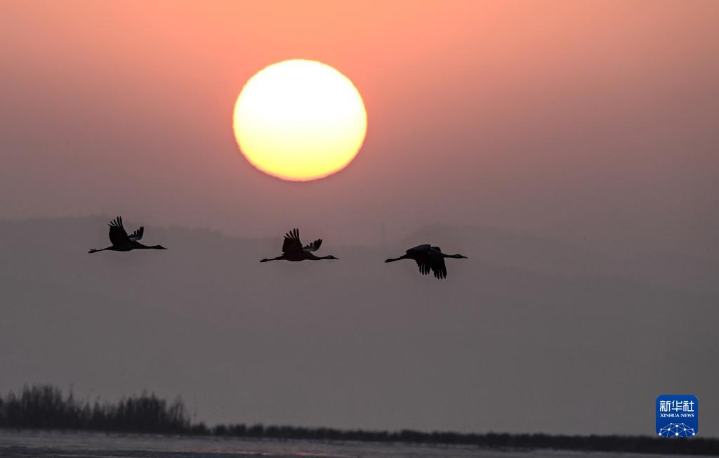 在贵州草海国家级自然保护区迎着朝阳起飞的黑颈鹤(2021年1月13日摄)。新华社记者 杨文斌 摄