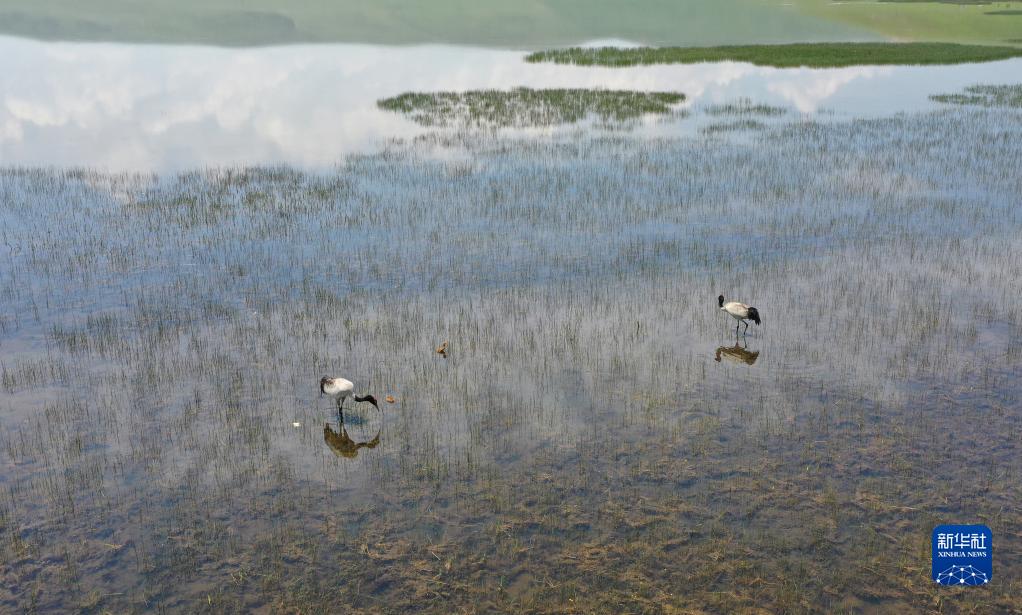 这是位于青海省海北藏族自治州门源回族自治县鸳鸯花海湿地中的黑颈鹤(2022年6月24日摄,无人机照片)。新华社记者 李占轶 摄