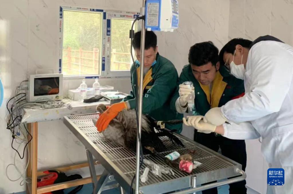 2020年秋季,西宁野生动物园的工作人员在救助落单的黑颈鹤“小灰”。新华社发(西宁野生动物园供图)