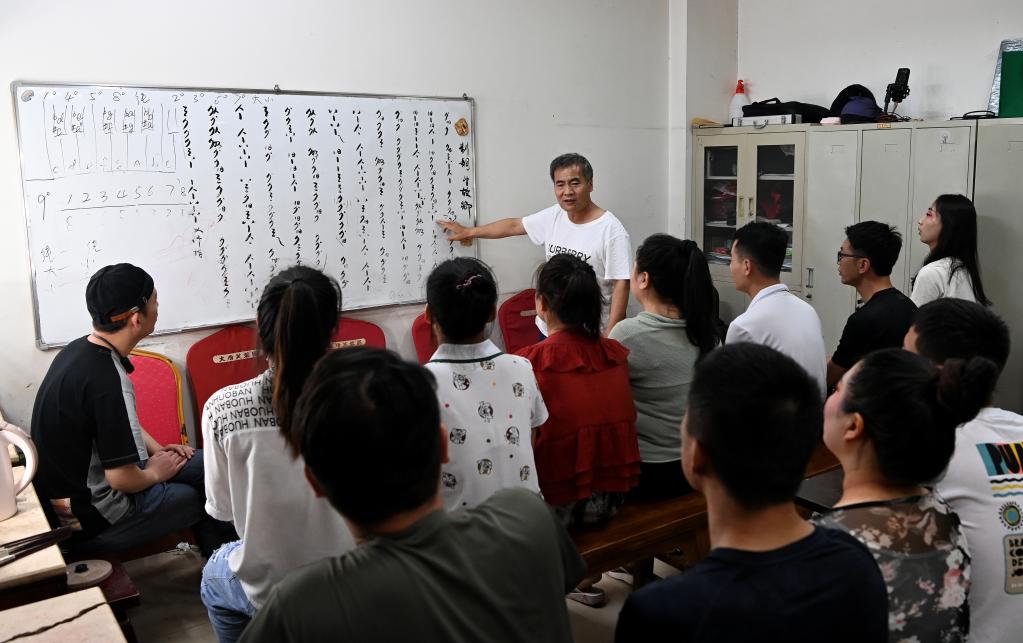 6月23日,西安东仓鼓乐社乐师在给乐手们韵曲《望故乡》。 新华社记者 刘潇 摄