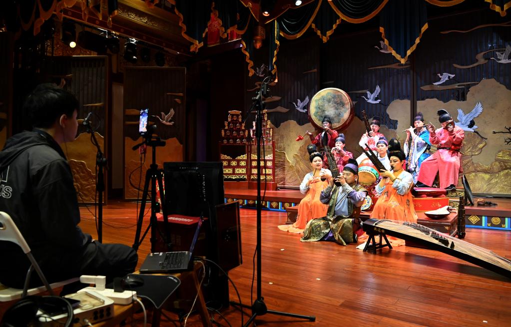 今年4月,由于疫情影响,线下观众减少。东仓鼓乐社的年轻乐师们,选择入驻短视频平台进行线上直播。