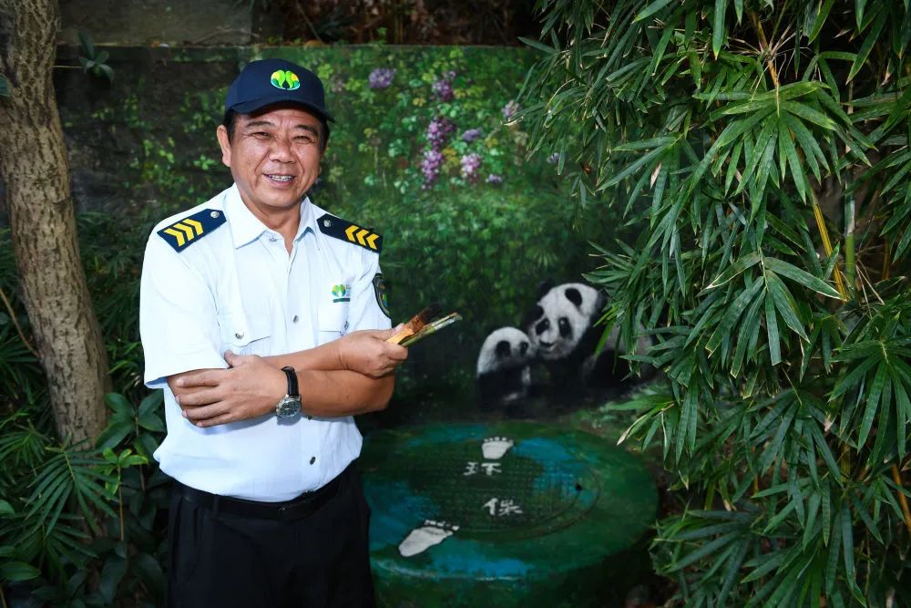 李平在深圳园博园等公园的井盖上留下的部分绘画作品(拼版照片)。