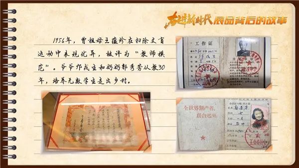 邝文媛得知自己一家四代的教师工作证件被展出后,自豪又激动。她看着曾祖母王蕴珍的扫盲教师荣誉证书,想起曾祖母那双饱含沧桑又充满光亮的眼睛:“它们诉说着那一代乡村教师的奉献与心向光明。”
