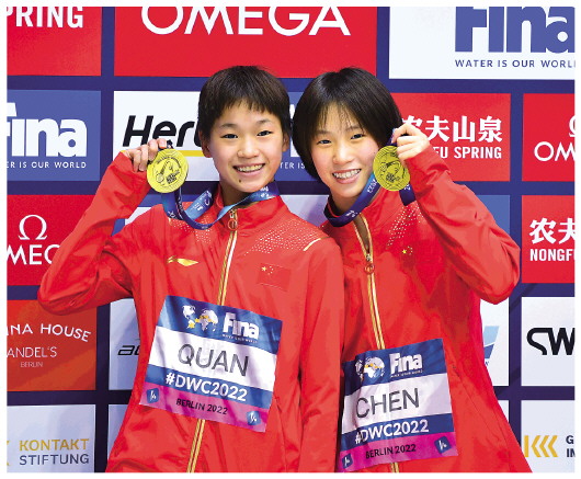 左图:10月21日,陈芋汐(右)/全红婵在颁奖仪式上合影。右图:10月21日,陈芋汐/全红婵(前)在比赛中。当日,在德国柏林举行的2022年跳水世界杯女子双人10米台决赛中,中国组合陈芋汐/全红婵以349.80分的成绩获得冠军。 新华社记者任鹏飞摄