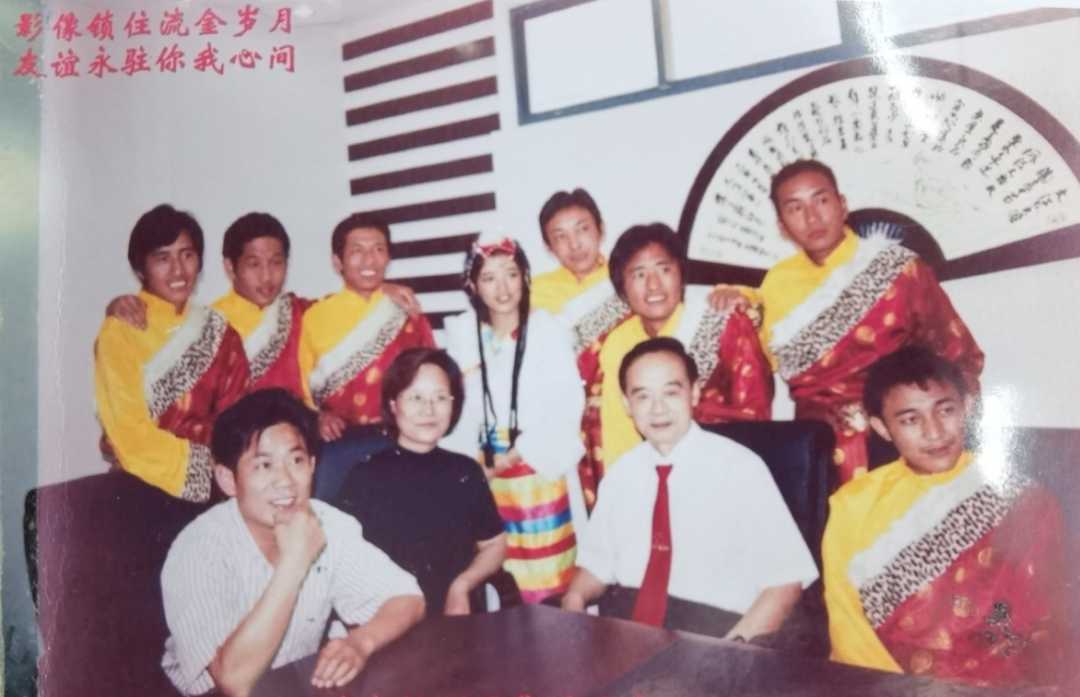 2003年土木工程系元旦晚会结束后,8名藏族学生和老师合影。前排左一为辅导员唐良辉,后排右四为次旦卓玛,后排右三为一起拾金不昧的仁增曲扎。