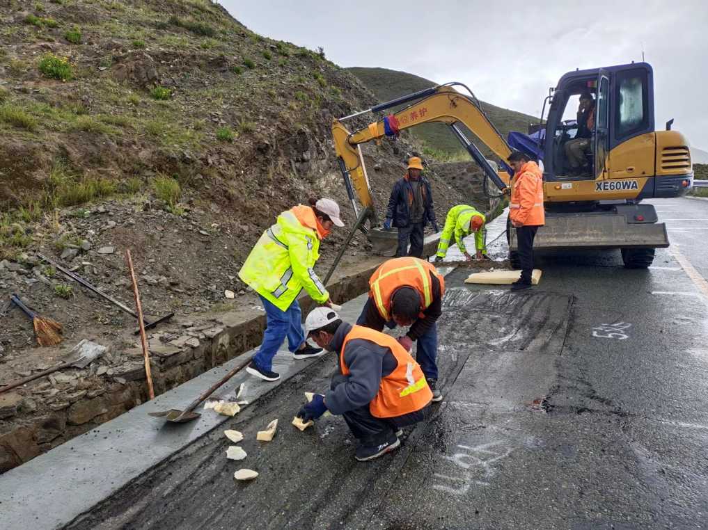 次旦卓玛(左一)与同事在养护路段上工作。