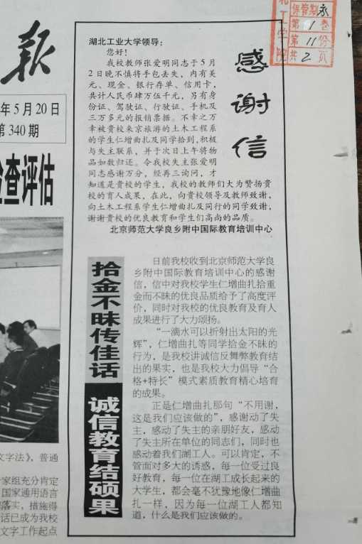 2004年5月20日,湖北工业大学校报刊登次旦卓玛等3位藏族学生拾金不昧的事迹。陈凌 摄