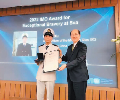 据了解,“海上特别勇敢奖”是国际海事组织设立的国际海事领域重要奖项,每年评选一次,主要表彰那些在面临生命危险情况下,采取特别勇敢的行动,以超乎寻常的勇气设法在海上拯救生命,防止或最大程度减少对海洋环境损害的人们。国际海事组织在其官网上称:“鉴于这名中国大副英勇无畏的救人精神,授予其2022年国际海事组织‘海上特别勇敢奖’,以表彰他在营救两名船员时表现出的勇敢、决心和耐力。”据悉,该奖项今年共收到总计41个提名,最终获得“海上特别勇敢奖”奖章的仅许波一人。