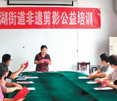 张桂英(中)在社区进行剪纸公益培训。