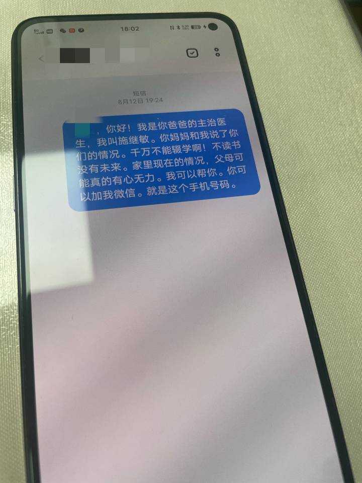 说明心意,问患者要来了小涵的联系电话,当天晚上,施医生就给小涵发了一条短信:“你妈妈和我说了你们的情况,千万不能辍学啊!不读书没有未来。家里现在的情况,父母可能真的有心无力。我们可以帮你……”