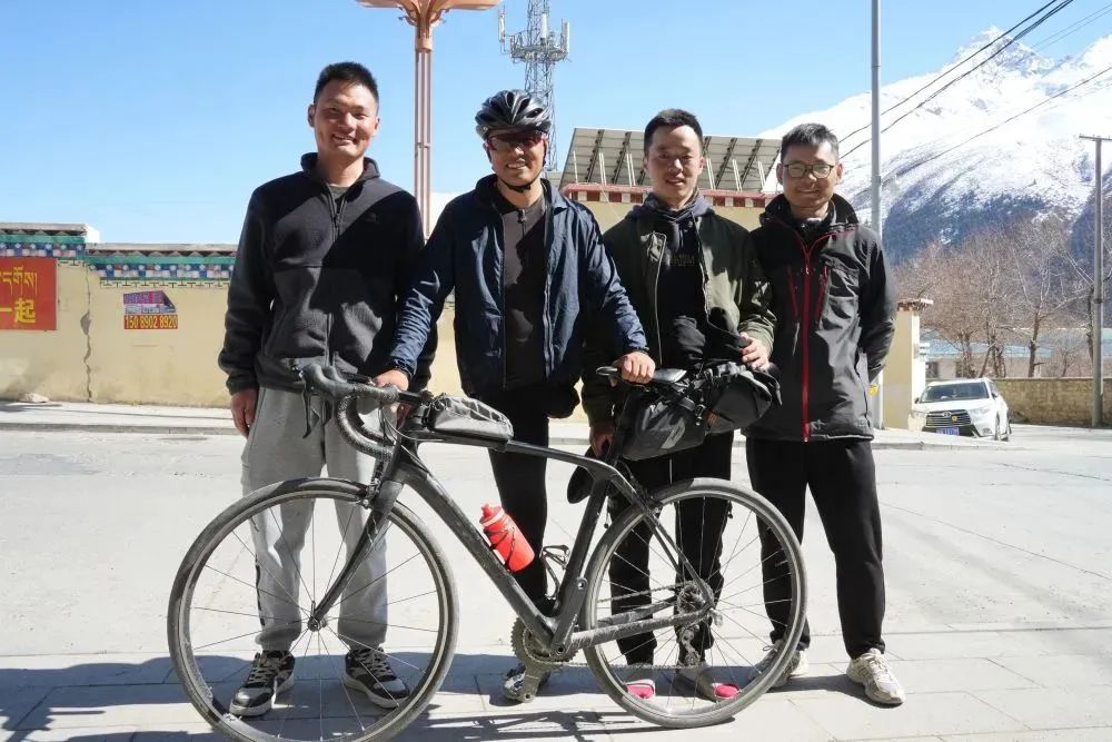 孙有志和骑友在西藏昌都然乌湖畔合影。新华社记者 陈尚才 摄