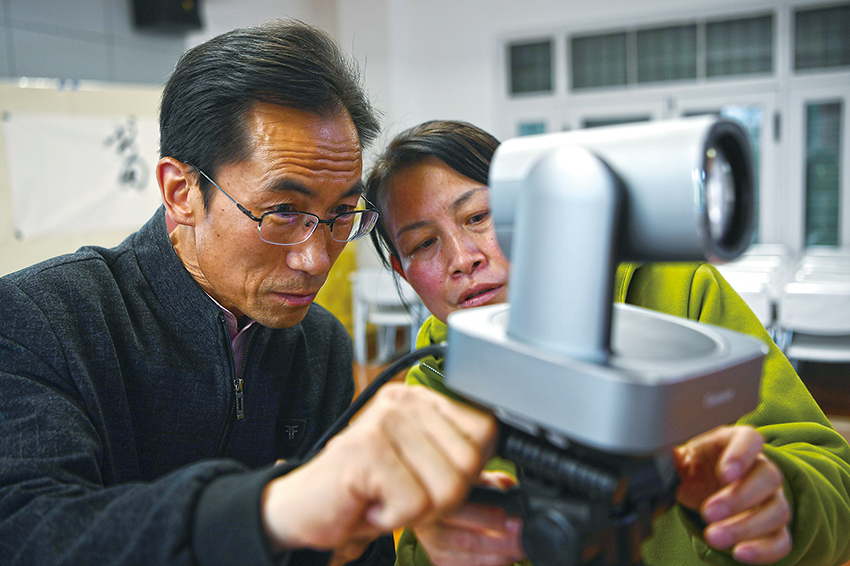朱彦军和同事在静宁县文化馆调试设备,为“世界读书日”活动做准备(4 月 10 日摄)。 新华社记者方欣摄