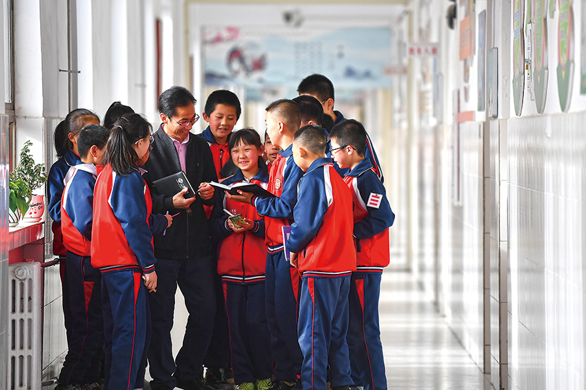 朱彦军在静宁县城关小学和孩子们交流阅读心得(4 月 10 日摄)。 新华社记者陈斌摄