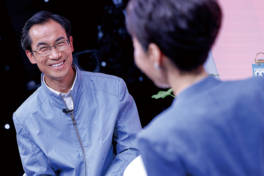 4 月 12 日,在中国教育电视台一处演播室,朱彦军(左)受邀参加《育见》栏目关于“世界读书日”系列访谈的录制。 新华社记者刘金海摄