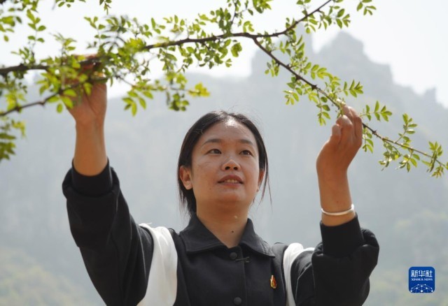 陈晓丽在贤麻沟村查看花椒长势(4月18日摄)。新华社记者 李嘉南 摄